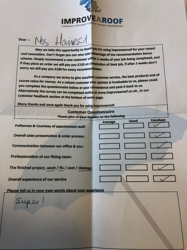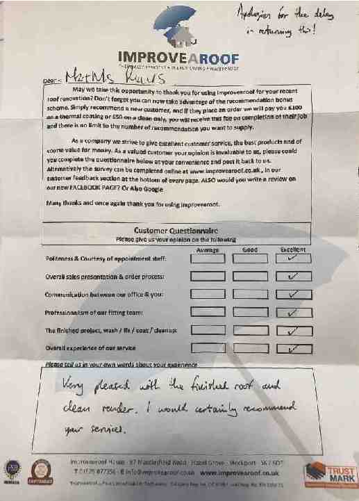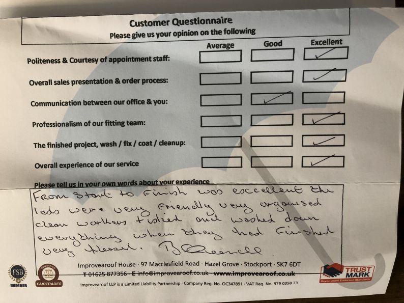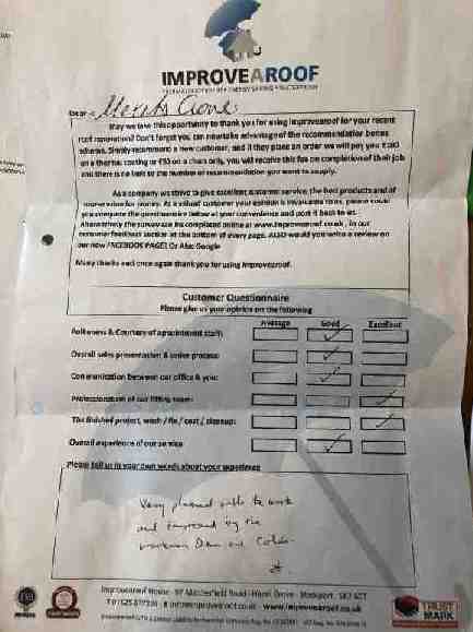 Read a selection of the feedback forms that we have received from satisfied Improve A Roof customers. We continue to enjoy extremely high levels of customer satisfaction.