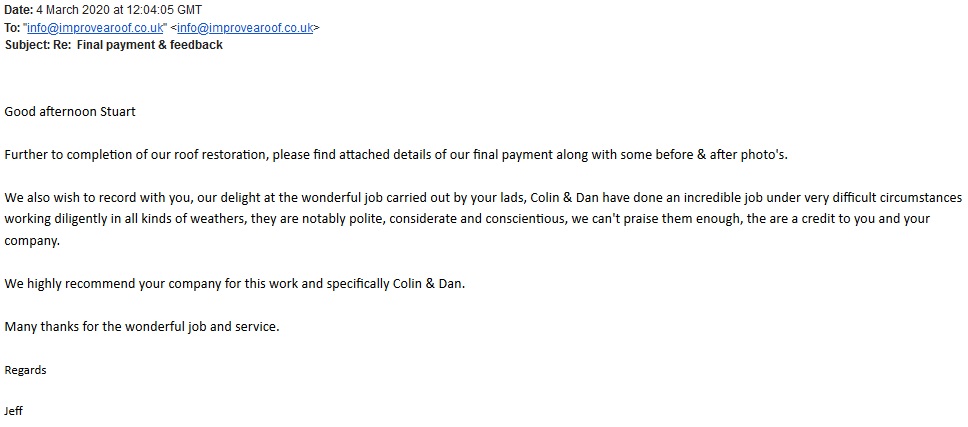 Despite the cost we are very happy with the result and have no hesitation in recommending IMPROVE A ROOF to anyone.
